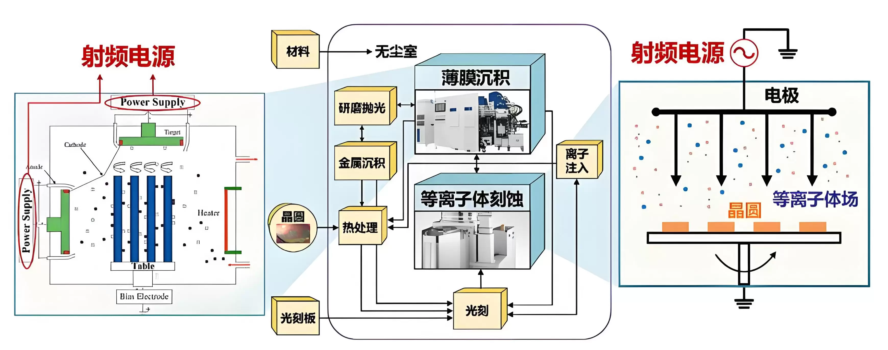 离子注入是半导体工艺中常用的技术,它可以将材料中的一些杂质替换为其他元素,以改变其电学性能。射频电源在离子注入过程中提供电能,从而使离子加速并注入到半导体材料中。