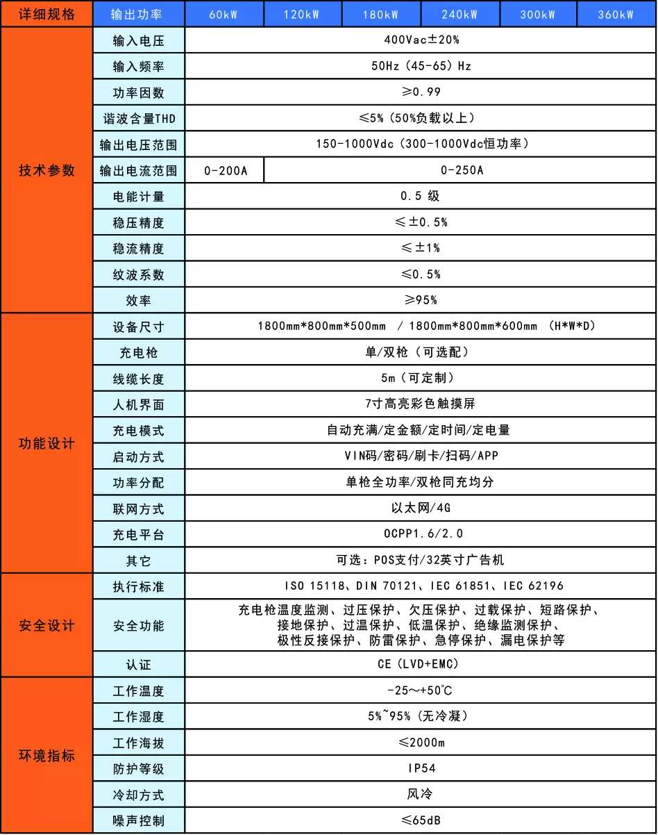 欧标直流充电桩符合欧洲执行标准,已有CE认证。适用于欧洲市场专用充电站(公交车、出租车、公务车、环卫车、物流车等)、公共充电站(私家车、通勤车、大巴车)、高速公路充电站等需要直流快速充电的场合,特别适合场地受限情况下的快速部署。