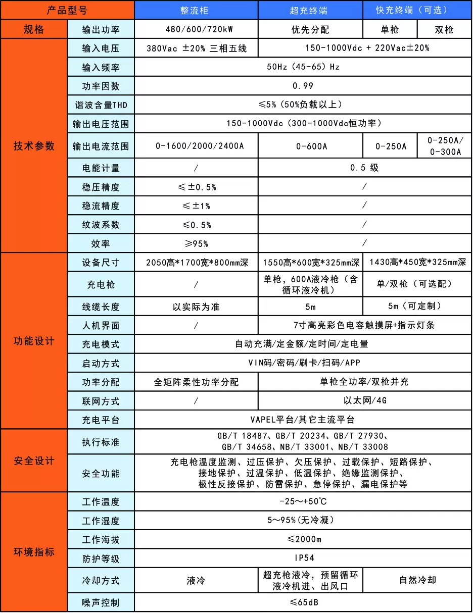 480/600/720kW全液冷超充堆(超充+快充)是有整流柜(液冷充电模块)、超充终端(1把600A液冷枪及其循环)、快充终端(单枪250A、双枪各250A、双枪各300A,可自由搭配)总枪数12枪组成,适用于环境恶劣的专用充电站(公交车、出租车、公务车、环卫车、物流车、重卡车、工程车等)、公共充电站(私家车、通勤车、大巴车、网约车)、高速公路充电站等需要直流超速充电的场合。