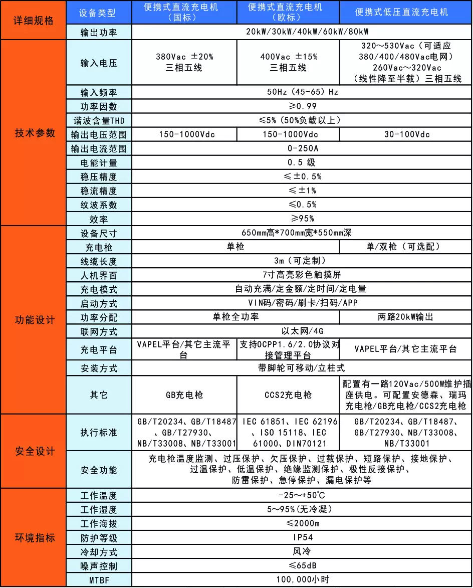 便携式直流充电机适用于专用充电站(公交车、出租车、公务车、环卫车、物流车等)、公共充电站(私家车、通勤车、大巴车)、高速公路充电站等需要直流快速充电的场合。便携式低压直流充电机适用于物流车、叉车、观光车、机场地面服务车、轨道工程车等。